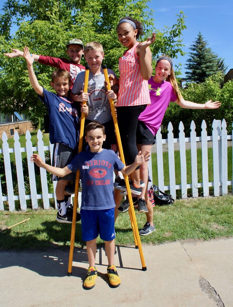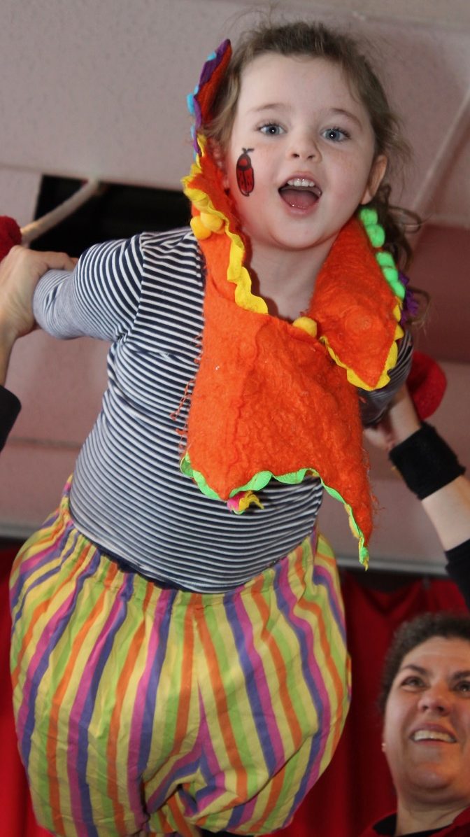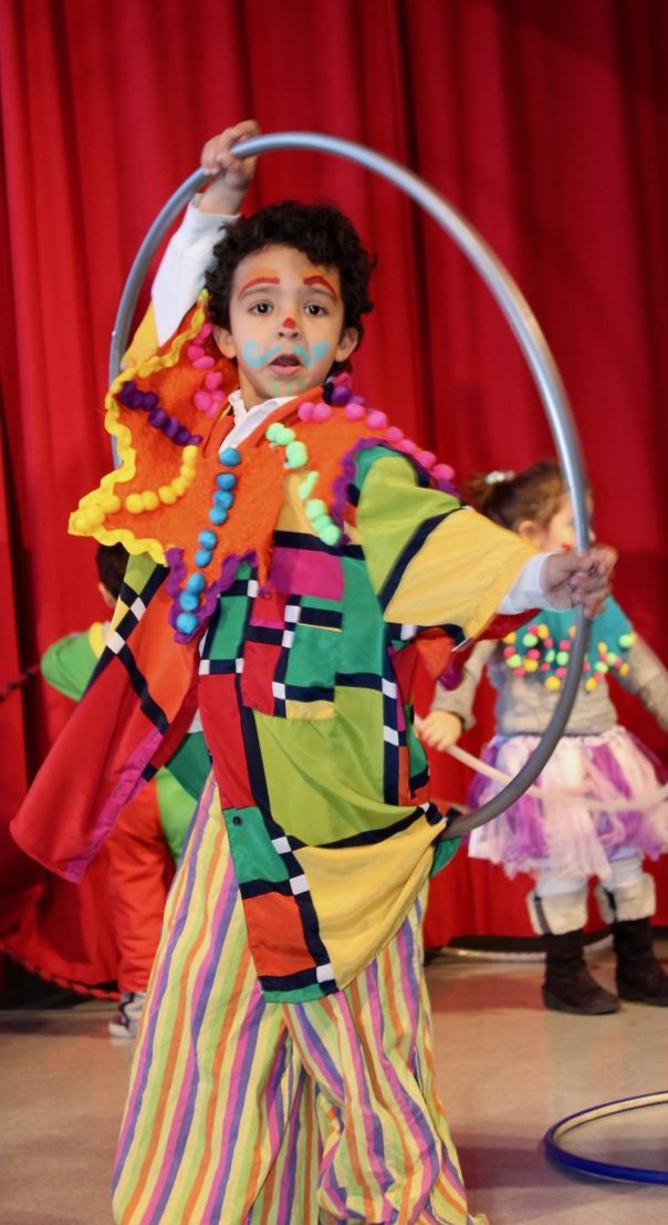 We set up stations with the circus skills. Every station will have an adult station boss who gives instruction & oversees safety at his/her station. We give a quick demonstration of each skill and then the children are divided in small groups and receive hands-on instruction at each station.