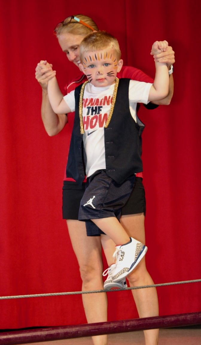 Comfortable clothing for lots of physical activity. Gym shoes are recommended and must be worn for unicycling and tightwire. Their performing outfits will be worn over their clothes.